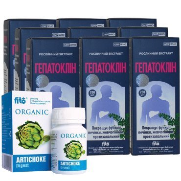В складі: Гепатоклін 200 мл - 9 упаковок, Артишок органічний капсули - 1 упаковка.