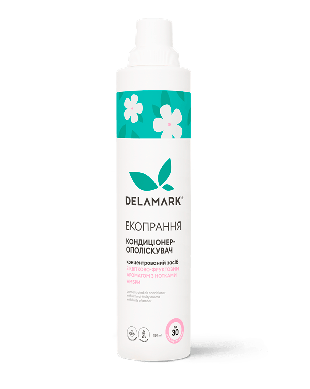 Концентрований безфосфатний кондиціонер-ополіскувач DeLaMark з квітково-фруктовим ароматом з нотками амбри спеціально розроблений, щоб зробити чисту білизну м'якою та ніжною. Підходить для тканин всіх типів. Додатково дезінфікує і додає тонкий аромат фруктового саду. Знімає статичну електрику та полегшує прасування.