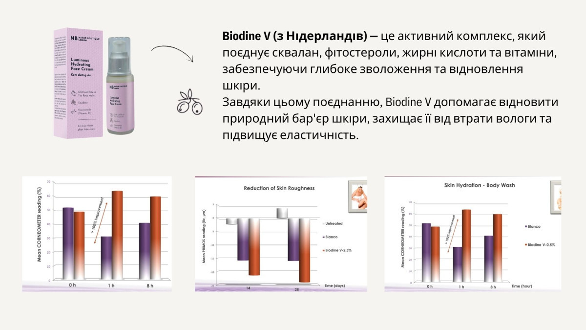 Комплекс Biodine V містить сквалан і є сумішшю рослинних ліпідів, які імітують ліпіди шкіри, підвищуючи зволоження та зміцнюючи бар'єр шкіри.