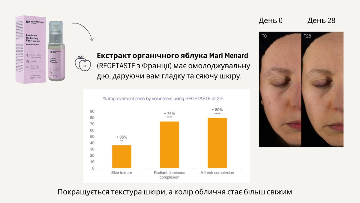 Унікальний екстракт органічного яблука (REGETASTE) має клінічно доведений ефект вирівнення тону шкіри та надання їй свіжого та здорового вигляду.
