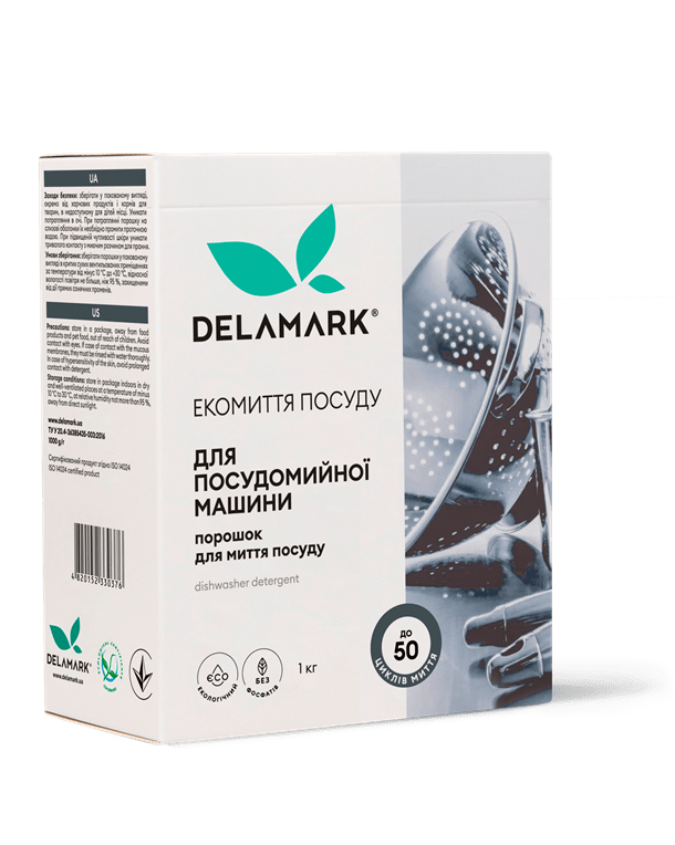 Концентрований порошок для миття посуду DeLaMark спеціально розроблений для безпечного й економічного використання в посудомийних машинах. Не містить фосфатів, хлору, лаурилсульфат натрію, ароматизаторів, барвників та консервантів. Ефективно видаляє залишки їжі. Дезінфікує. Має низьке піноутворення, тому добре змивається невеликою кількістю води. Підходить для миття дитячого посуду.