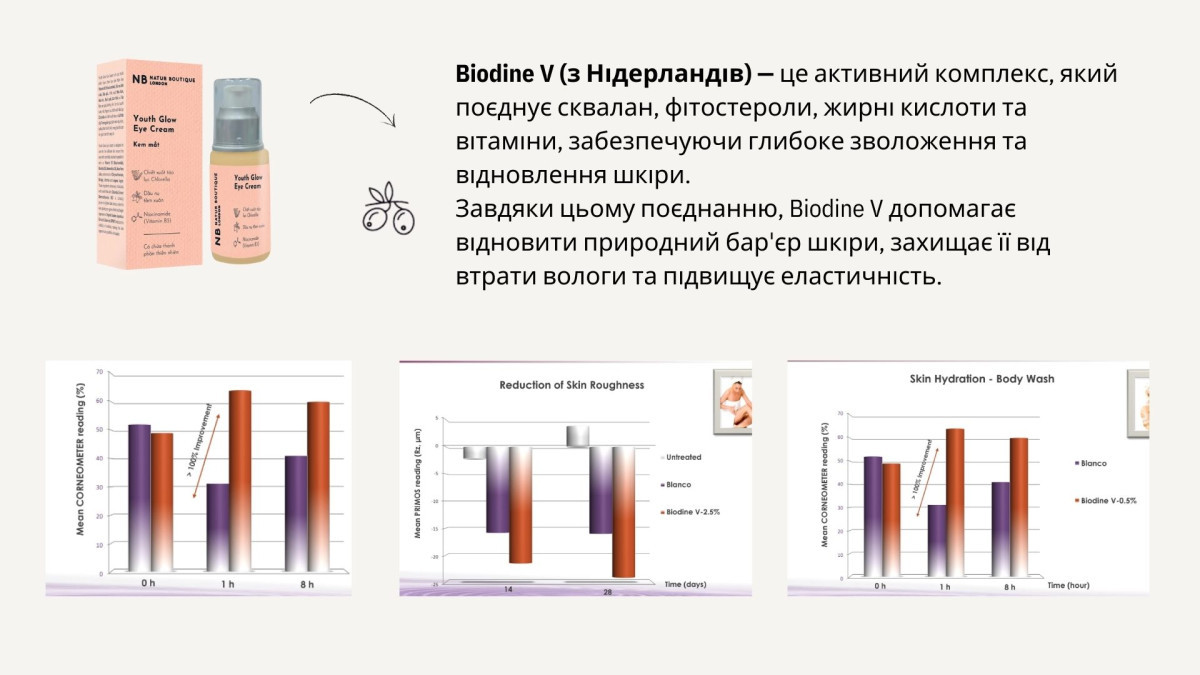 Комплекс Biodine V містить сквалан і є сумішшю рослинних ліпідів, які імітують ліпіди шкіри, підвищуючи зволоження та зміцнюючи бар'єр шкіри.