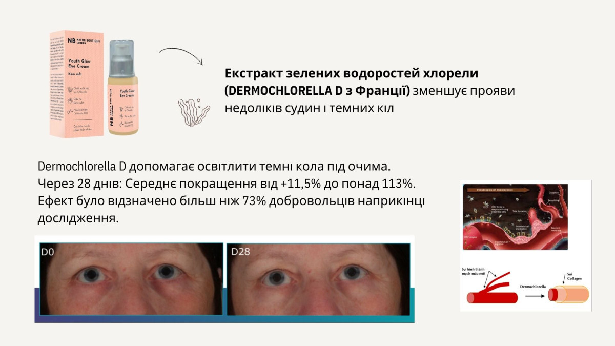 Екстракт хлорели (DERMOCHLORELLA) має клінічно доведений ефект освітлення темних кіл під очима, надаючи вашому погляду свіжий і яскравий вигляд.