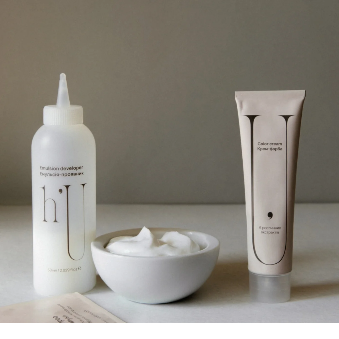 Фарба H'U має кремову текстуру, яка не тече й забезпечує рівномірне фарбування натурального волосся та сивини біля коренів. Важливо: наносіть фарбу рясно, щоб волосся було повністю просочене, для якісного результату.