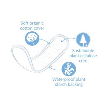 The pads are composed of organic cotton (not bleached with chlorine, no pesticides used in growing cotton that are abundant in conventional cotton), cellulose (not bleached with chlorine, obtained from FSC certified wood pulp), corn starch (waterproof breathable material obtained from from non-genetically modified corn, biodegradable).