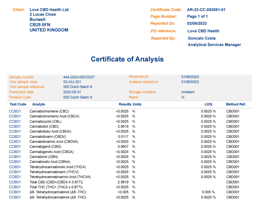 Ви маєте право знати, що ви купуєте, і бути впевненим, що продукт містить рекламовану кількість CBD. Важливо, щоб ваш продукт CBD містив дозволений рівень THC та інших контрольованих речовин. Тому результати лабораторії є важливими, і тому для аналізу використовується акредитований UKAS заклад для пакетного тестування всіх продуктів від LoveCBD. Нижче наведені опубліковані результати лабораторії CBD, які ви можете прочитати.