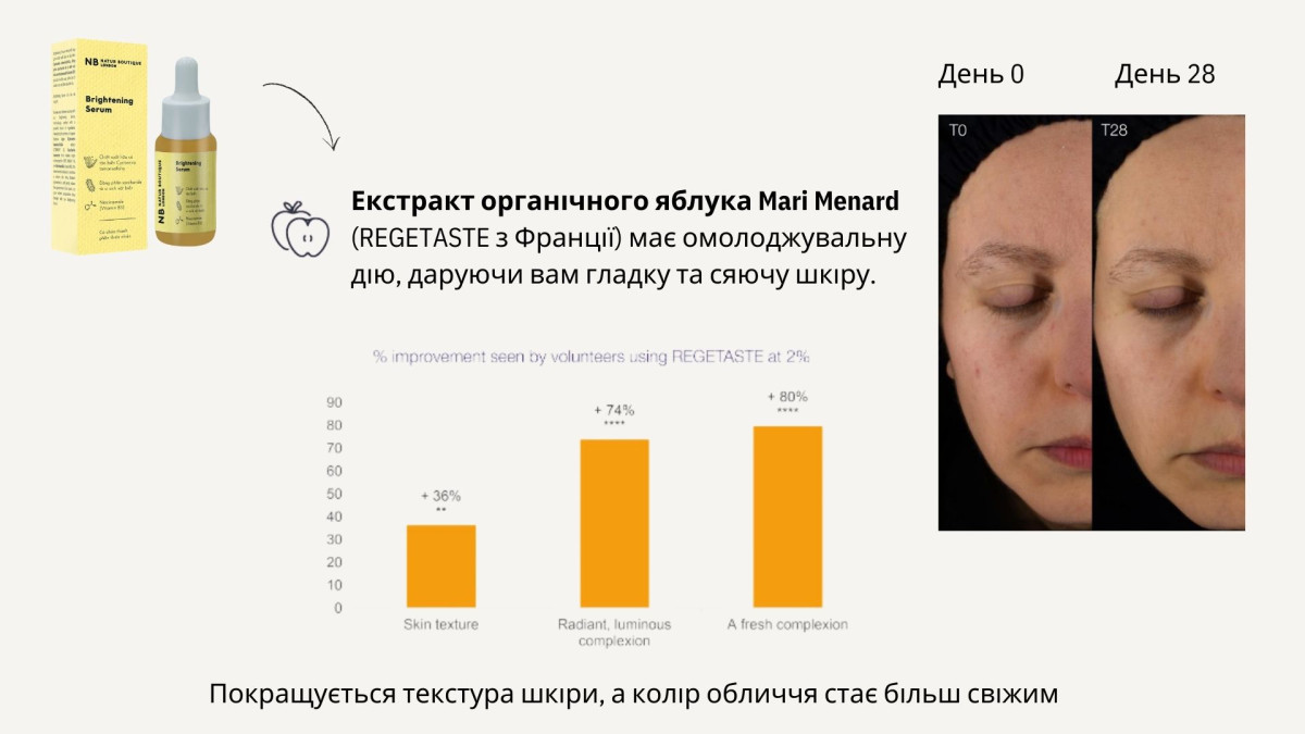 Унікальний екстракт органічного яблука (REGETASTE) має клінічно доведений ефект вирівнювання тону шкіри та забезпечення більш свіжого вигляду.
