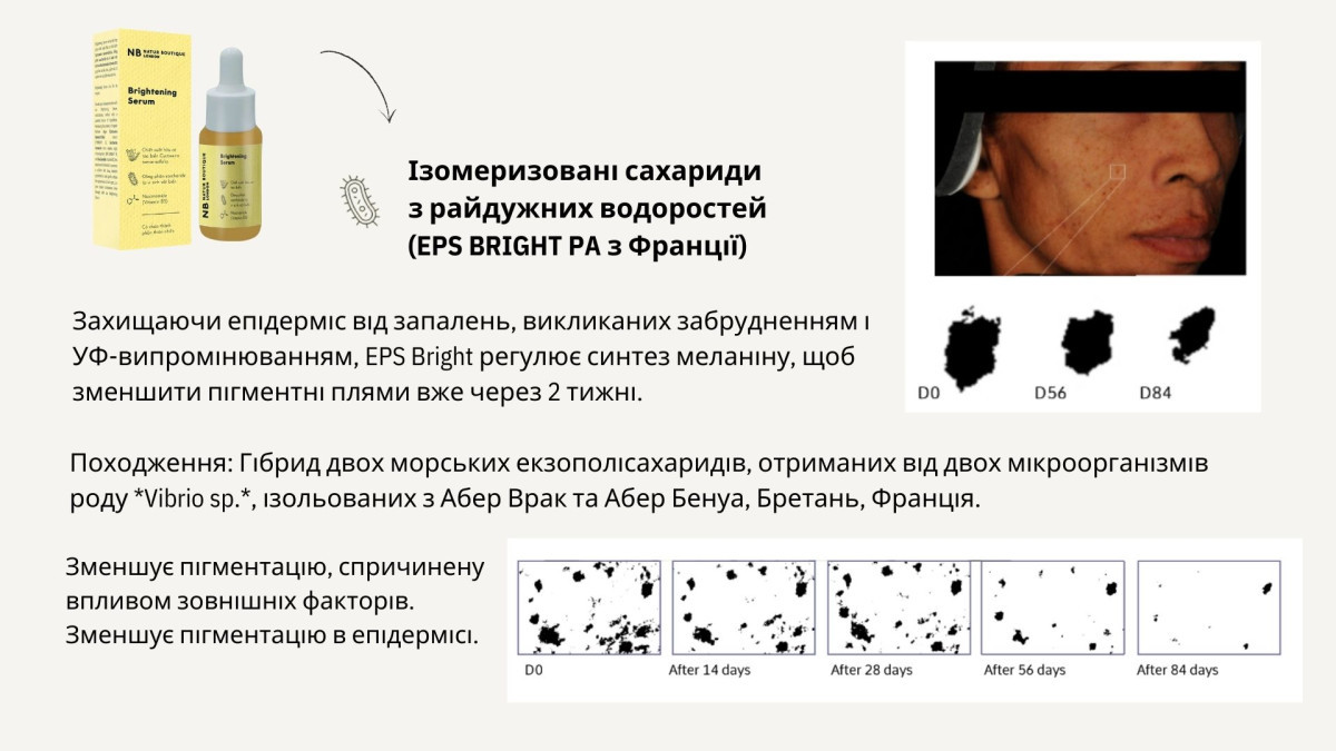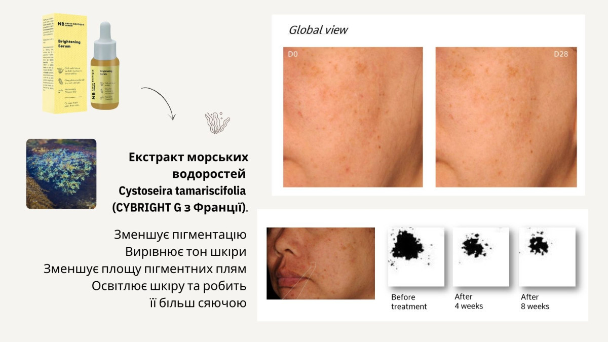 Завдяки екстракту водорості Cystoseira tamariscifolia (EPS BRIGHT), сахаридному ізомерату з райдужних водоростей (CYBRIGHT) та ніацинаміду (вітаміну B3), ця сироватка впливає на вироблення меланіну (темного пігменту) в епідермісі.